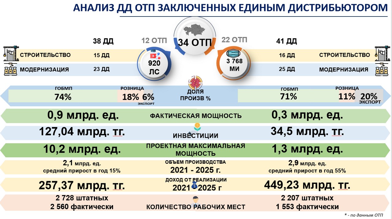 Согласно информации, представленной ОТП, по состоянию на сентябрь 2021 года фактическая мощность производства медицинских изделий составляет 300 млн. единиц в год, а лекарственных средств – 900 млн. единиц в год.
