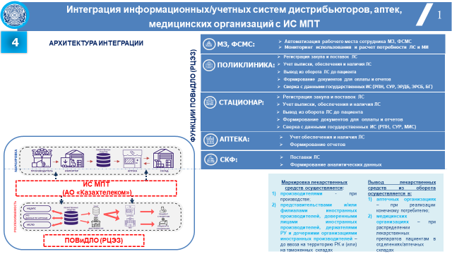 По результатам пилотного проекта Единым дистрибьютором были согласованы доработки информационной системы мониторинга движения медикаментов от производителя до конечного потребителя с использованием маркировки и идентификации упаковок в соответствии с бизнесом-процессами движения медикаментов. Таким образом, актуализировав схемы бизнес-процессов, АО «Казахтелеком» с учетом особенностей деятельности Единого дистрибьютора подготовил и представил прототип информационной системы в начале текущего года. В настоящее время проводится тестирование прототипа на складах Единого дистрибьютора.